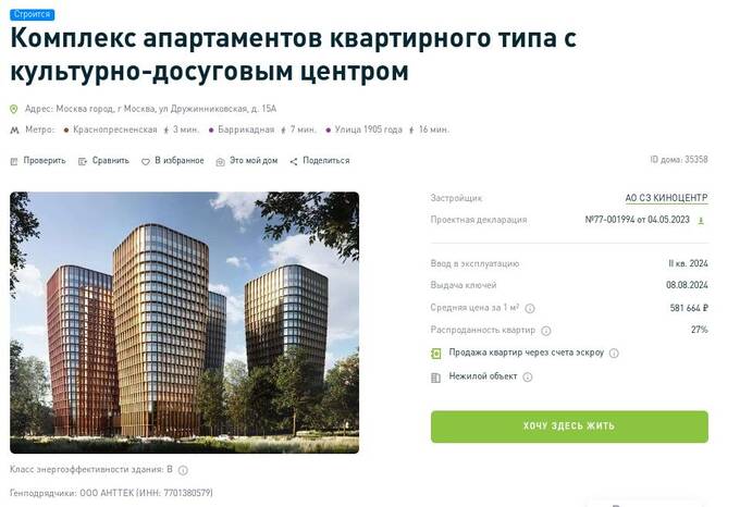 Судя по данным единой информсистемы жилищного строительства, строительством комплекса апартаментов квартирного типа с культурно-досуговым центром на ул. Дружинниковская, д. 15А (а по данным площадок по продаже жилья - по Дружинниковская, 15) занимается АО "Специализированный Застройщик "Киноцентр". При этом распроданность объекта, несмотря на среднюю стоимость "квадрата" - 581 664 рубля, составляет 27%. Сдать объект в 23 этажа с классом недвижимости "элитный" планируется во втором квартале 2024 года.