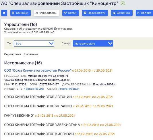 Примечательно: по данным "Руспрофайл", учредителями АО "Специализированный застройщик "Киноцентр" в своё время были союзы кинематографистов Грузии, Армении, Молдавии, Литвы и других стран, а также Союз кинематографистов России под председательством Никиты Михалкова. И в источнике дата выхода этого юрлица из АО указана как 2021 год.