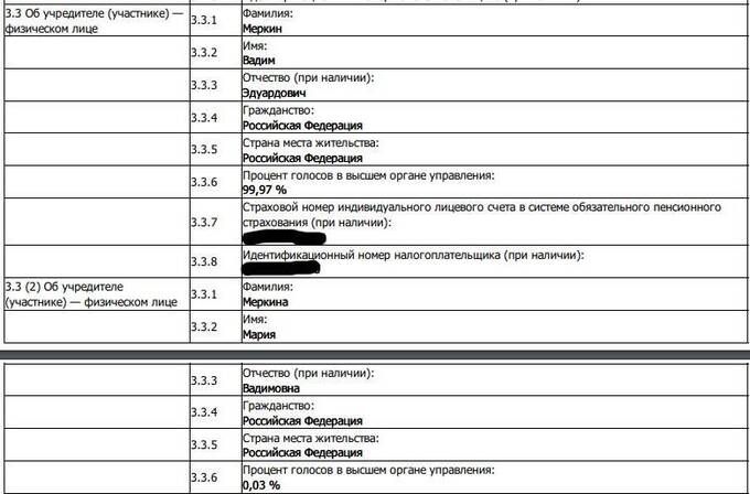 По данным единой информсистемы жилищного строительства, бенефициарами АО "Специализированный Застройщик "Киноцентр" являются Вадим Эдуардович Меркин (доля 99,97%) и Мария Вадимовна Меркина. При этом Меркин является акционером с июня 2022 года, до этого единственным акционером было иностранное юрлицо - "Брайтинвест инвестментс лимитед".