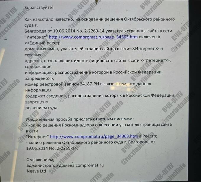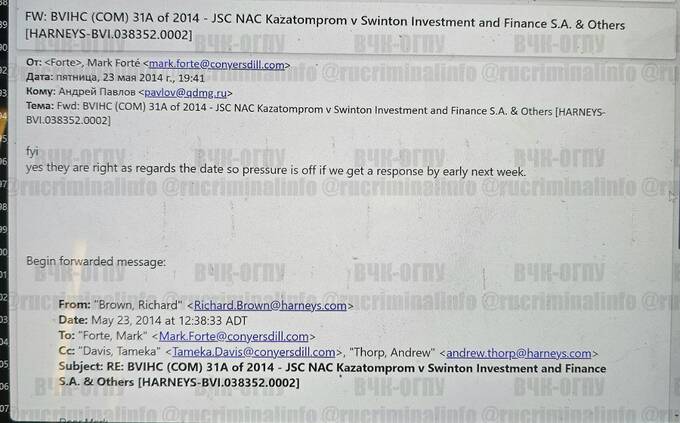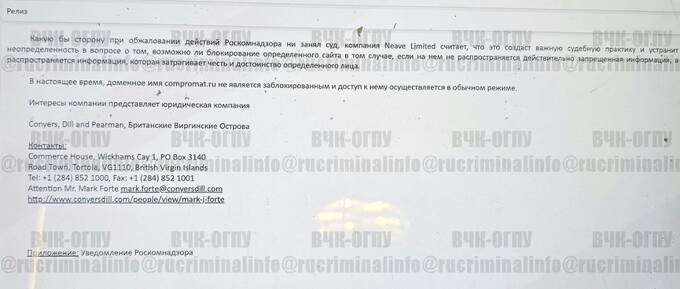 В архивах Павлова можно найти письма от Зуева, который все проблемы, которые возникали у Compromat.ru с Роскомнадзором, судами и т.д. , перенаправлял Павлову. Павлов либо лично, либо с помощью своих подчиненных по «Кворуму», готовил ответы, письма, возражения от имени офшора Neave Limited, на который было зарегистрировано доменное имя Compromat.ru. А контактное лицо, которое называется от имени Neave Limited – это давние партнеры Кворума, Павлова, Зуева, Клюева, которые участвовали во многих их «операциях», в том числе в отношении клиентов из Казахстана.