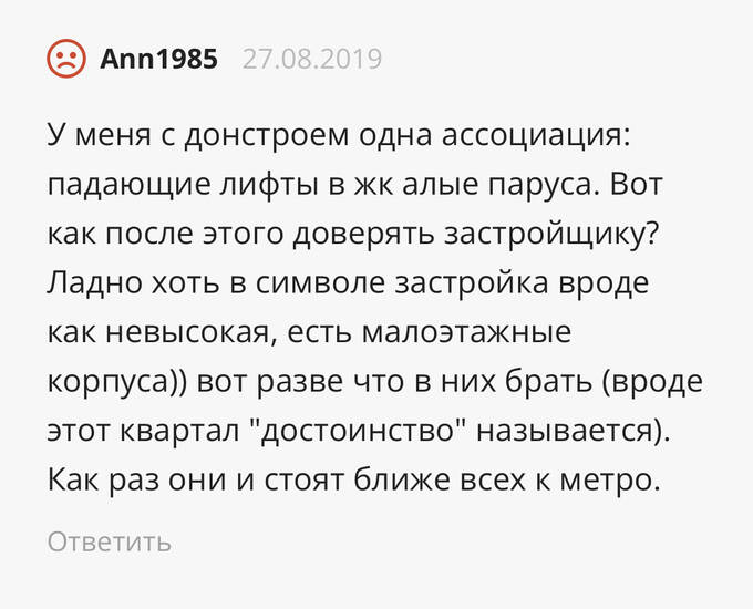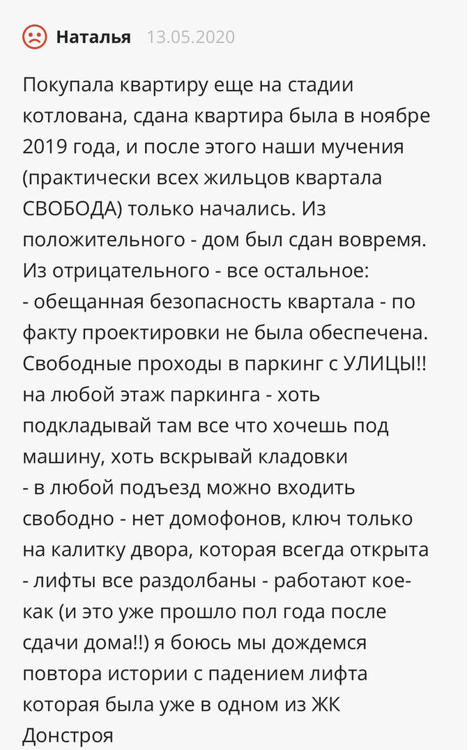 При этом, Донстрой абсолютно наплевал на все правила, и дальше начал забивать всевозможные источники хвалебными отзывами. Но среди них можно сразу найти комментарии от реальных людей, которые указывают на то, что в ЖК «Символ» не все так хорошо, как об этом указывают в застройщике.