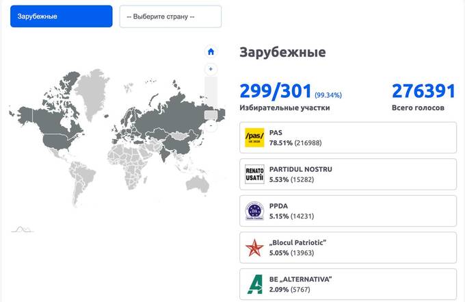При этом занявший второе место внутри страны "Патриотический блок" Додона за рубежом получил только четвертое место, взяв чуть более 5%. Его обошли "Народная республиканская партия" с 5,53% и партия «Демократия дома» (5,15%).