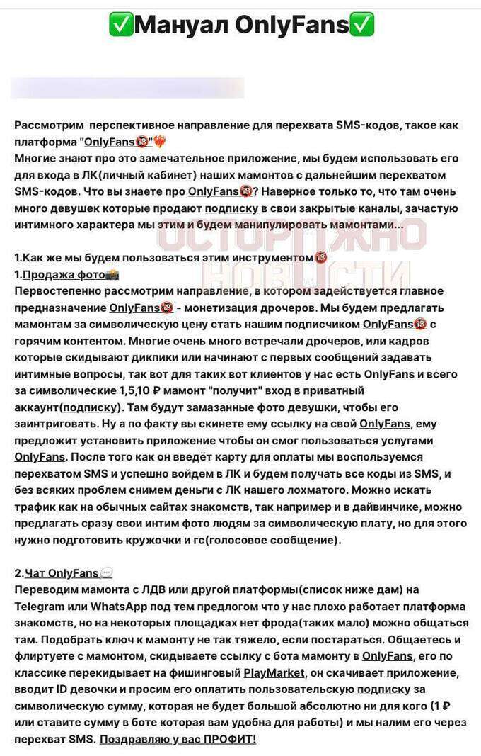 Для всех методов обмана разработаны многочисленные мануалы, в которых объясняется, как работает схема, как лучше подать предложение и вести диалог. К примеру, мошенники используют фейковый аналог платформы Onlyfans для перехвата СМС, чтобы взломать банковские приложения (на 1–3-м скриншоте пример такого обмана).