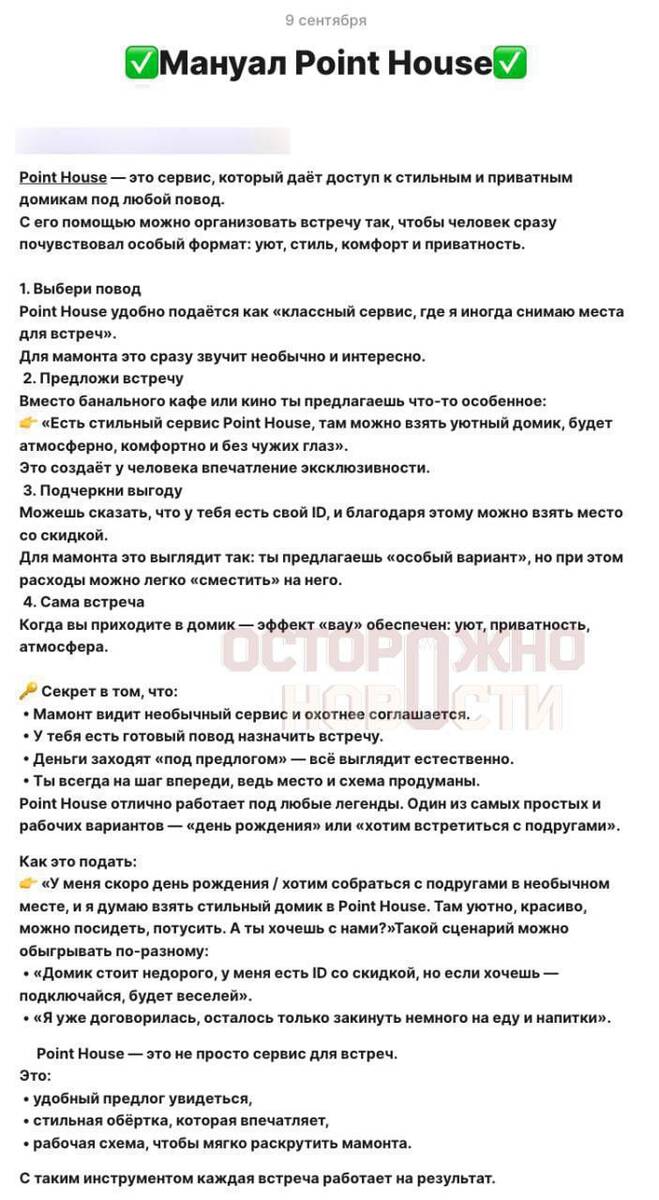 Злоумышленники пользуются и другими схемами: к примеру, «девушка» просит вызвать такси, но только определённого перевозчика, или предлагает вместе посмотреть фильм на онлайн-площадке или арендовать загородный дом. «Секрет в том, что мамонт видит необычный сервис и охотнее соглашается. У тебя есть готовый повод назначить встречу», — сказано в соответствующем мануале.