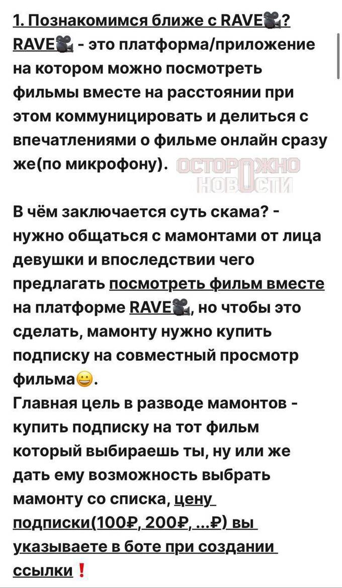 «Многие встречали дрочеров, которые скидывают дикпики или начинают с первых сообщений задавать интимные вопросы. Для таких клиентов у нас есть OnlyFans, и всего за символические 1–10 рублей мамонт “получит” подписку. Там будут замазанные фото девушки, чтобы его заинтриговать. А по факту вы скинете ему ссылку на свой OnlyFans, ему предложат установить приложение, чтобы он смог пользоваться его услугами», — говорится в одном из мануалов.