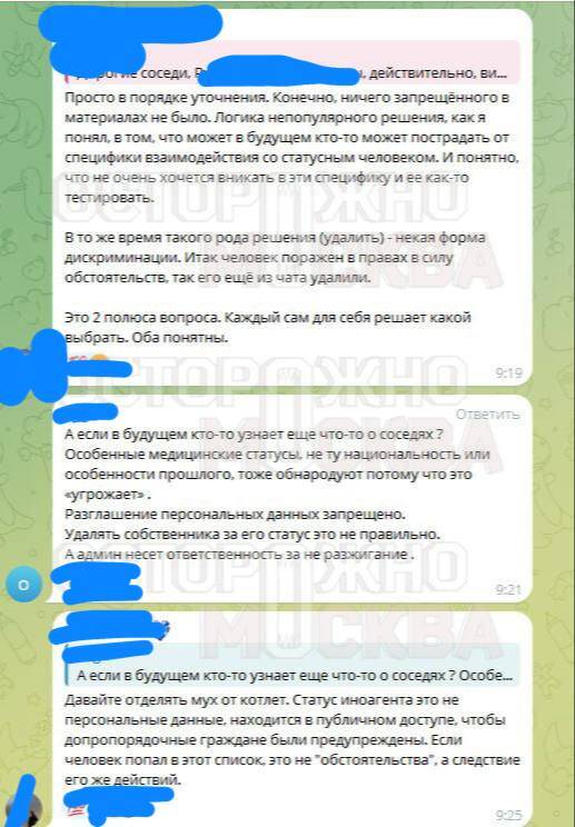 Через несколько дней после так и нерешенного конфликта соседку, просившую не шуметь по утрам перфоратором, удалили из чата из-за статуса иноагента. Об этом узнали другие жители дома и разделились на два лагеря. Одни говорят о том, что боятся штрафов за общение с соседкой-иноагентом и не знают должна ли в переписке соблюдаться маркировка, другие, что это ущемление прав женщины и переживают, что и другие личные данные жильцов, например медицинские, будут вынесены на публичное обсуждение.