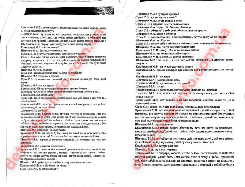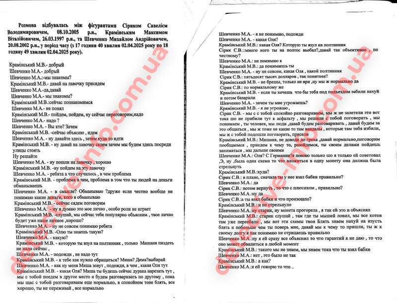 По информации Dетектив-Info, ближе к вечеру 2 апреля 2025 состоялось персональное знакомство между Шевченко с одной стороны и Кременским и Сириком - с другой. Во время этого рандева в районе Соборной площади "сумские албанцы" в лучших традициях рэкетирского жанра эпохи "бурых 90-х" в ярких красках очертили "криптану" его неутешительные перспективы за "бросок" доверчивой инвесторки. Однако и не подозревали, что их припыленные специфической лексикой и недвусмысленными намеками высказывания "не для лишних ушей" тщательно документируются правоохранителями, к которым накануне с заявлением о вымогательстве обратился тезка знаменитого Кобзаря.