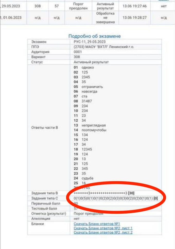 Была проверена только моя тестовая часть, за сочинение стоит 0 баллов, хотя мои бланки с сочинением висят на сайте. 0 я никак не мог получить, так как я написал более 150 слов. Обращались с данной проблемой в РЦОИ, они никак это не комментируют и не хотят разбираться» - рассказывает выпускник из Лобни, по его словам, такая же проблема у 15 учеников сдававших экзамен вместе с ним.