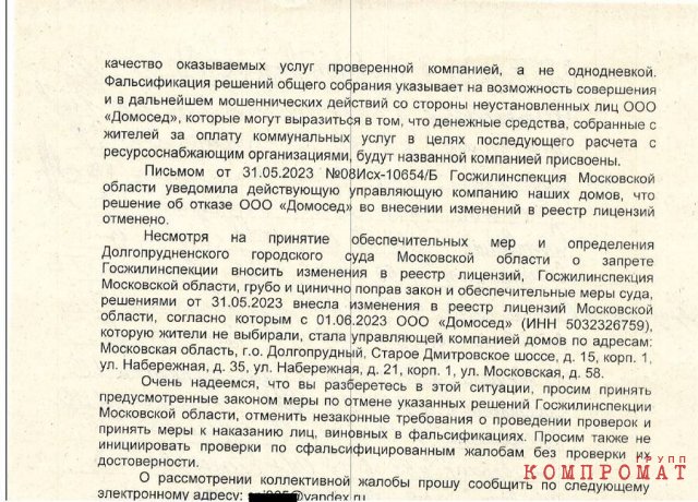 «Мы никогда и ничего до настоящего времени не слышали об указанной организации и никогда не видели сотрудников ООО «Домосед» в наших домах, – говорится в обращении разгневанных жителей, направленного в адрес губернатора области, прокуратуры, Следственного комитета, органов МВД и Жилинспекцию. – Информацию о том, что ООО «Домосед» уже подало заявления в ГУ МО «Госжилинспеция МО» (ГЖИ) о включении наших домов в их лицензию мы узнали от действующей управляющей компании ООО «Стройжилинвест», которое разместило в общедомовых чатах письмо ГЖИ».