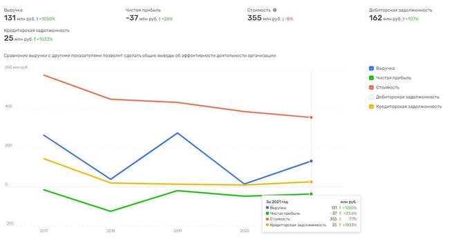 Ещё три – удосужились "отчитаться" за 2021. АО "Судоэкспорт" – с графиком выручки таким, что наводит на мысли об искусственном вливании и выводе средств, на конец 2021 года имеет -37 млн рублей в прибыли и 25 млн рублей долга при выручке в 131 млн рублей и стоимости 355 млн рублей. "Пшик" для судостроительного завода. Для сравнения, какая-нибудь среднестатистическая компания, занимающаяся сельским хозяйством https://www.rusprofile.ru/id/3004838, стоит дороже.