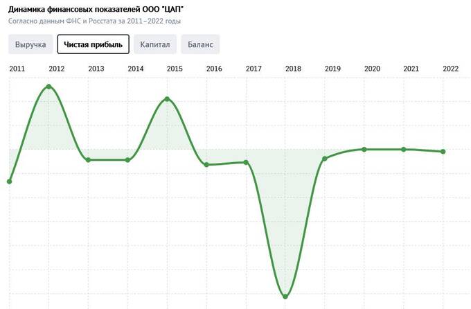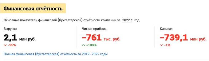 Это предприятие было ликвидировано в 2020 г. Его финансовые показатели очень странные, выручки нет, убыток – 2.2 млн руб., размер капитала – (-4.6 млрд руб.).