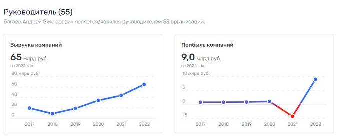 Сам Багаев руководил 55 организациями, из них 19 действующие. Анализ финансовой деятельности компаний Андрея Багаева вызывает недоумение. Их выручка росла с 2018 г. и в 2022 г. достигла 65 млрд руб. А вот прибыли до 2022 г. не было, в 2021 г. компании получили убыток на 4.4 млрд руб. Экономическими законами такие финансовые показатели объяснить нельзя. Возможно, что через ликвидированные компании Багаева выводились деньги. А их более трех десятков – непаханое поле для силовиков.