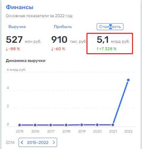 На сегодняшний день выручка АО «СК «Донстрой» - 527 млн руб., прибыль – 910 тыс. руб. В 2020 г. выручка была 15 млрд руб., прибыль – 0. При этом в 2022 г. стоимость компании была увеличена на 7328% до 5.1 млрд руб.