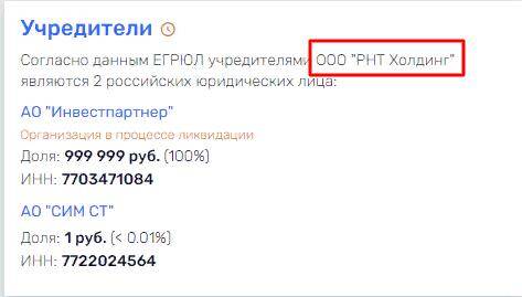 Учредители ООО «РНТ-холдинг» - АО «Инвестпартнер» (в процессе ликвидации) и АО «СИМ СТ» (в процессе банкротства).