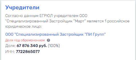 Эта компания управляет несколькими структурами, имеющими признаки фиктивных организаций: в штате 0 или 1 сотрудник, выручка 0. Например, ООО «Специализированный Застройщик «Март», чьим учредителем является ООО «Специализированный застройщик «ПИ Групп». Доля этой компании находится под обременением банка ВТБ. Госбанк финансирует пустышку.