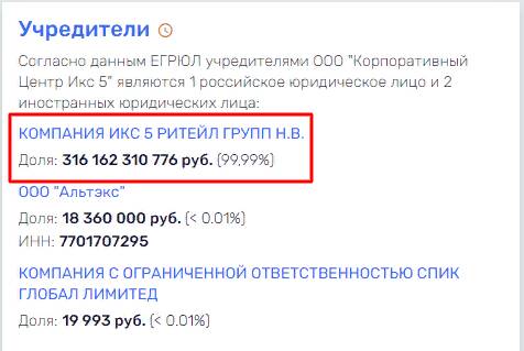 Основным учредителем ООО «Корпоративный Центр Икс 5» является офшорная компания - КОМПАНИЯ ИКС 5 РИТЕЙЛ ГРУПП Н.В (99, 99%), так что зарабатываемые ритейлером деньги могут утекать из России.