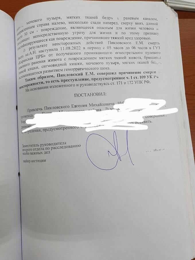Однако затем дело было изъято в третий отдел по особо важным делам краевого СК, который квалифицировал действия Пикловского по статье 111 УК - умышленное причинение тяжкого вреда здоровью, повлекшее смерть потерпевшего. Следствие установило, что Пикловский умышленно, из личного огнестрельного оружия, в присутствии Симонова, произвел выстрел в Аксенова. В результате Аксенову было причинено проникающее огнестрельное сквозное ранение живота, от которого он и скончался. Пикловский был заключен под стражу.
