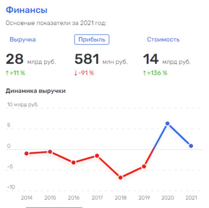 АО «Первый канал в 2021 г. получил выручку 28 млрд руб., она выросла на 11% по сравнению с прошлым годом. А вот прибыль, на удивление, упала на 91% и составила 581 млн руб. Но самое интересное, что с 2014 г. по 2020 г. канал работал без прибыли. Финансовая отчетность за 2022 г. не опубликована, там может быть громадный минус.