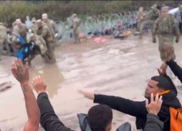 Солдаты Национальной гвардии штата стали использовать щиты, чтобы оттеснить нелегальных мигрантов, которые пытаются пройти через границу, огороженную колючей проволокой на берегу реки в Игл-Пасс.