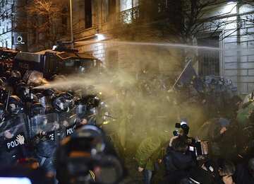 В Тбилиси на митинге против закона об иноагентах полиция начала применять перцовый газ и водометы.